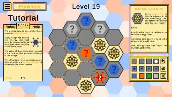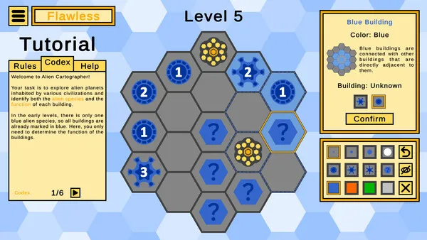 Alien Cartographer is a Minesweeper-like logic deduction puzzle game, where the player has to identify various buildings on a hexagonal grid using environmental hints and the strict rules of their architecture.