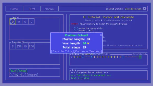 I made this game because I love the Brainfuck language, and I wanted to share it in the most enjoyable way I could think of.
