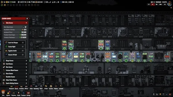 Casino Operations: Build and design your own casino within your resort, choose from a variety of games to offer, and assign them to specific areas to attract different types of patrons and increase your profits.