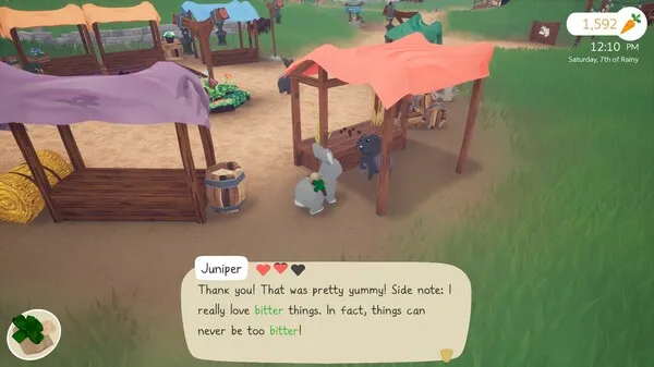 Sugar Creek Burrows is a quaint village bustling with fun and quirky buns. Unlock new dialogue as you progress the relationship and gift them your baked goods to discover their individual taste preferences.