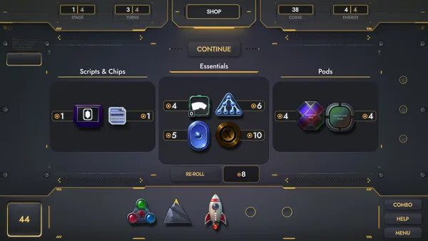 After conquering each level, the Shop awaits with Amulets alongside other essential tools like Tokens, Scripts, and Chips. Tokens are tactical one-shots that manipulate the board or supercharge combos. Scripts & Chips offer different paths: Chips permanently unlock new abilities, while Scripts deliver powerful one-time effects.
