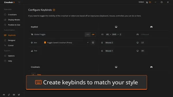 - Toggle: Toggle the visibility of your crosshair with many different mouse states and keyboard shortcuts