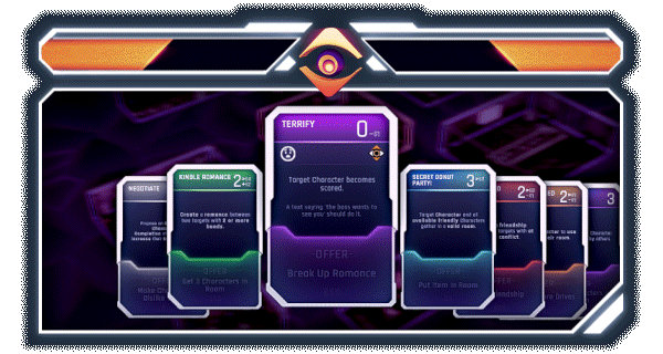 Play cards to spy on people, make deals, and ask for favors. Curate your deck mid-scenario to give yourself strategic options. Cards have subjective value, so you’ll have to make tough tactical decisions. What’s better–a card that makes a person love dolphins, or a card that makes someone eat a burrito?
