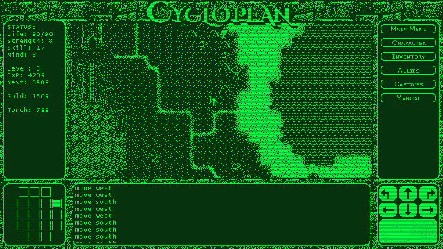 Cyclopean follows the tradition of early CRPGs like Ultima, Questron, and Legacy of the Ancients (among others) in that it presents two differing views of the game world.  Outside of dungeons, you see your character from the top down in a 2D display of the map.  Whereas, in dungeons, the view changes to a 3D, first person perspective.