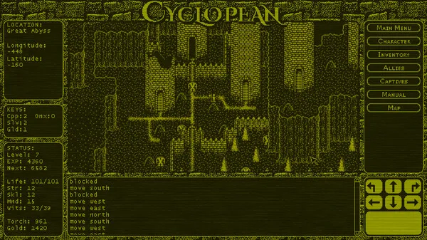 As of Version 0.9.936, you can now opt to play Cyclopean: The Great Abyss as a roguelike game with perma-death. The game will now prompt you when you first start it, whether you want the traditional CRPG experience or Roguelike Mode. You can always switch back by using the Options menu to restore the default settings. Games played in Roguelike Mode are not accessible via normal mode, and vice versa.