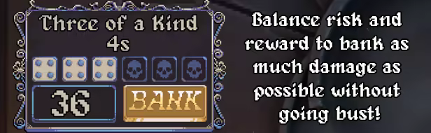 Engage in a game of Dice with the mysterious entity – collect new dice and their paired relics to warp your rolls into ever increasing layers of power and complexity. Bank your points to deal damage to your opponent, and pass before you push your luck too far or you’ll lose it all!
