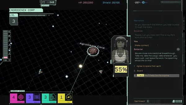 A 3rd-person action-roguelite space adventure that seamlessly blends text-based events with procedurally generated dungeons, offering hundreds of hours of replayability.