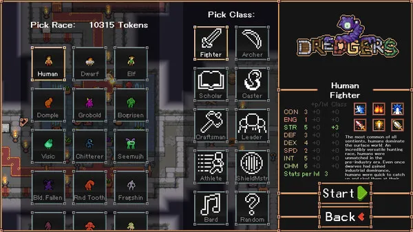Welcome to the world of dredgers. Dredgers are the men and monsters who all desire the gold and power lying in the dungeons beneath the earth. As a dredger you’ll be exploring dungeons, looking for gold, potions, scrolls, food and more to further your endless descent into the depths.