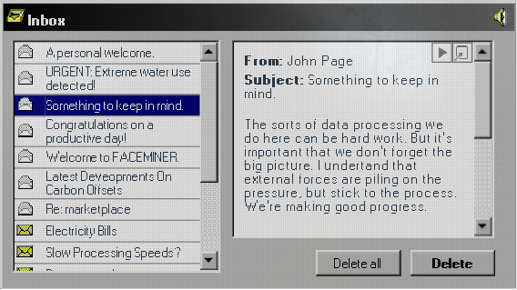 Mining alone is no fun! Learn more about your fellow miners and keep up to date with the office gossip through the internal corporate messaging system. Sift through messages to unravel the mysteries – and ultimate plans – of the shadowy creators of the FACEMINER software suite.