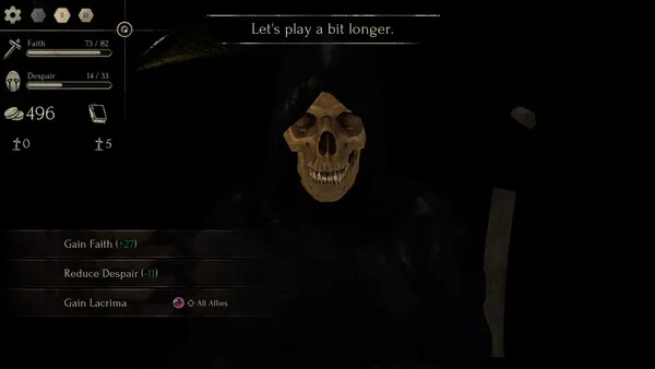 You are Faith. The last of your kind. The epilogue to an age-old tale of demise. You gamble for your life against Death itself. Day after day after day. Yet you persevere. You dare not abandon hope. You struggle against your inevitable fall into despair. To live – and play – another day.