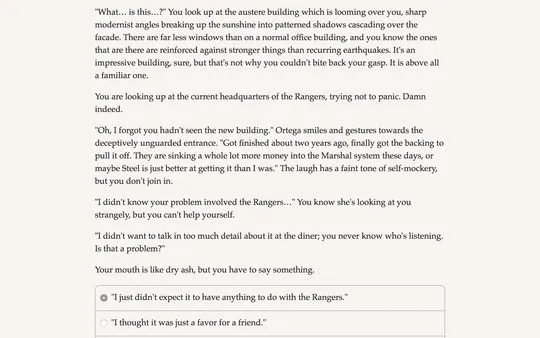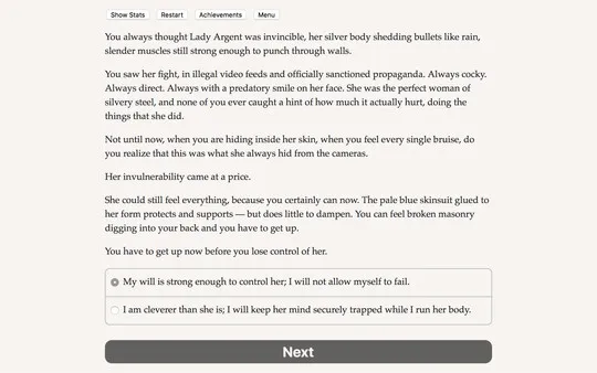 is a 380,000 word interactive novel by Malin Rydén, where your choices control the story. It’s entirely text-based—without graphics or sound effects—and fueled by the vast, unstoppable power of your imagination.