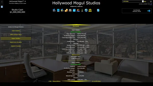 Hollywood Mogul 4 is a deep, complex TEXT-BASED strategy game. This business simulation puts you in charge of your own Hollywood movie studio. It is an immersive tycoon game about creating, producing, casting, and releasing movies and limited series around the world.
