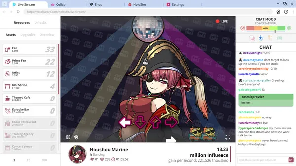 Step into a fantastic world of streaming! Holoidle is a relaxing idle game where you click and strategize to gain Influence and grow your audience. Purchase assets, collect Collab Cards, and keep your chat engaged for perfect efficiency!
