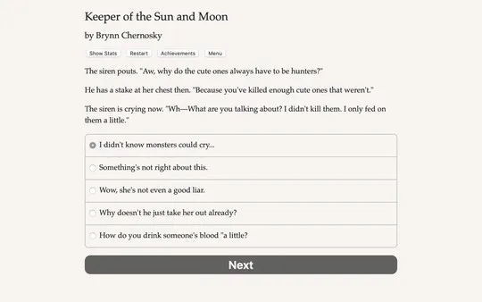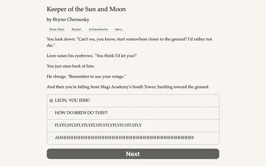 is a 310,000 word interactive fantasy novel by Brynn Chernosky, where your choices control the story. It’s entirely text-based—without graphics or sound effects—and fueled by the vast, unstoppable power of your imagination.