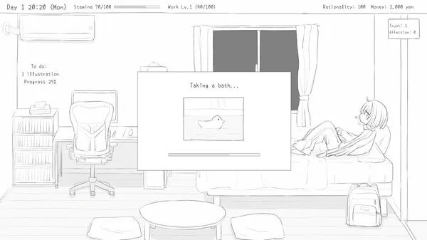 Finish different commissions and receive money to buy several reference books and some QoL improvements for your room to make your cohabitation life with your sister even better.