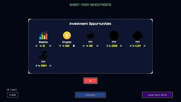 Luckyest is a fast, pick-up-and-play investment incremental where every reveal tempts your greed. Start with a small bankroll, pick a sector to invest and scratch through a grid of hidden outcomes. Cash out while you’re ahead—or push your luck for bigger multipliers at the risk of losing it all.