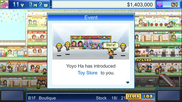 When your establishment’s popularity reaches a certain point, a “Fever” is triggered in which customers swamp your mall!