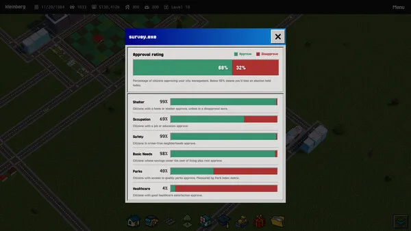 You set the rates of income, sales and corporate taxes. You charge for business licenses, bus fares, parking fees and more. Set rates too high and the cost of living will be unbearable. Set it too low and you won’t collect enough revenue. Whatever you choose, will shape your economy. Watch out for your approval ratings, citizens vote, and you lose the game when they vote for your rival.