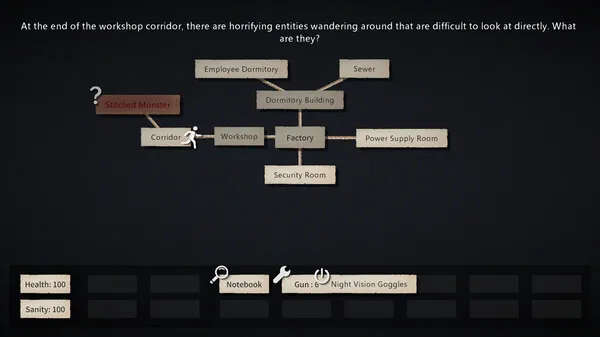 Explore the world by clicking on nodes, and interact with the world using items to solve puzzles. Understand the behavior of ghosts and urban legends by reading the rules, analyzing their weaknesses, and finding a way to survive through the correct actions. Live through a world filled with dangers and crises.