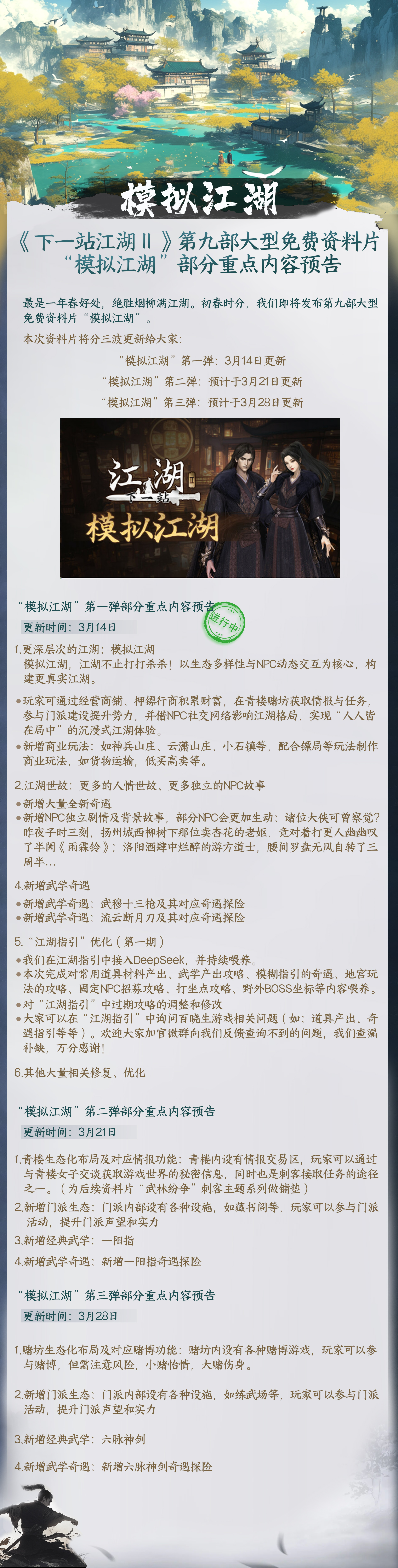 庞大内容、及时更新:上线迄今已超过百更、八部大型玩法资料片!2025年我们将继续砥砺前行,用更多更好玩的内容来填充这个江湖大世界!