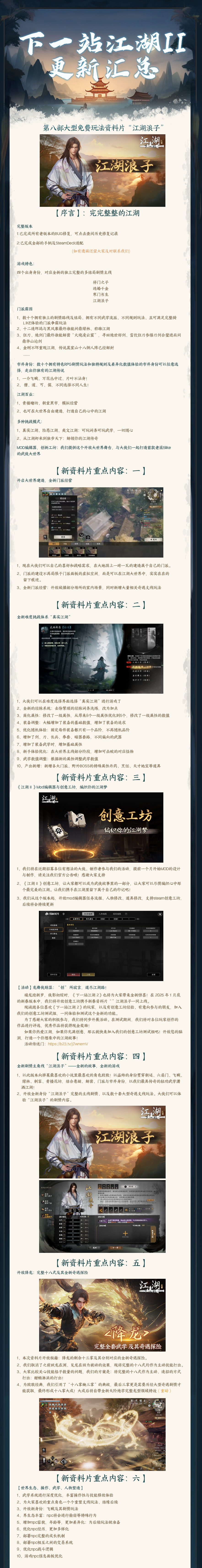 (“创新工坊”现已推出,当前已更新8个免费玩法资料片)《下一站江湖Ⅱ》是白玉京工作室研发的第二款3D单机武侠游戏,是一款包含了沙盒式的剧情主角养成、无缝大地图任意采集建造模拟经营、骑砍Like式门派霸图玩法的开放世界游戏,无内购、可离网游玩!