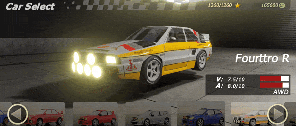 Rally: The classic mode, where you will drive through one of the four countries rallies, racing neck to neck with legendary drivers to conquer the gold cup. With 3 different difficulty levels, and 3 different wheel drives car categories, we exchange exhausting hour-long gameplays for some quick and always-changing short bursts of action with much more variety.