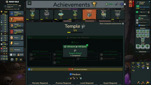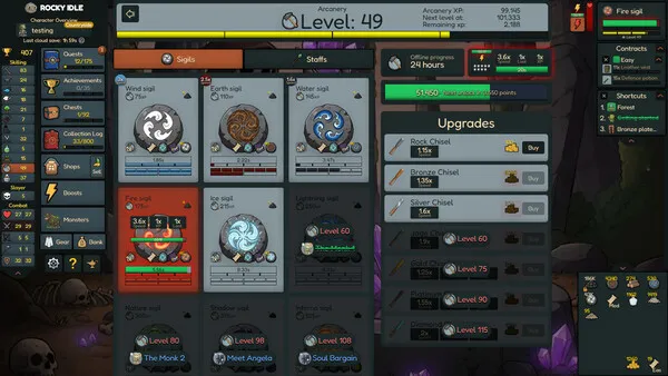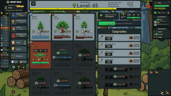 Rocky Idle is a single-player idle/incremental game. You can level up different skills, gather resources, and craft combat gear to defeat monsters and complete your collection log.