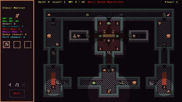 Descend through 20 randomised floors across 4 pixel art biomes in this stripped back, fast playing Roguelite. Plan your path wisely, make tough choices and enlist the help of mysterious strangers who wander the dungeon for their own purposes. Some runs will end in failure, but there will always be more heroes to take the place of the fallen.