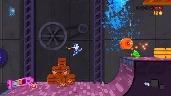 Each chapter in Seafrog is based on a ships theme. Battle vengeful Viking ghosts aboard the Sea Dragon. Dig in for an unsavory meal aboard the Chunky Chacken, where you’ll discover a man-eating chicken outbreak. Finally, get ready for some monkey business at The Sweater Factory, an abandoned workshop run by an unexpected crew of apes causing all the ruckus. Each chapter holds a Master Gear, guarded by an ultimate boss.
