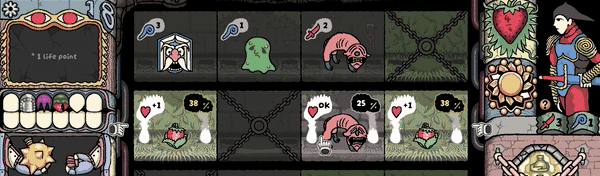 In Sol Cesto, your goal is to descend through the levels of a randomly generated underground world, diving ever deeper in search of the sun, lost for countless years. On the combat grid, choose one of four rows to move into. You’ll then land randomly on one of the four tiles in that row: will it be a monster that harms you? A chest full of gold? Or perhaps a deadly poison trap? Anything can happen…