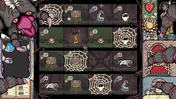 In Sol Cesto, your goal is to descend through the levels of a randomly generated underground world, diving ever deeper in search of the sun, lost for countless years. On the combat grid, choose one of four rows to move into. You’ll then land randomly on one of the four tiles in that row: will it be a monster that harms you? A chest full of gold? Or perhaps a deadly poison trap? Anything can happen…