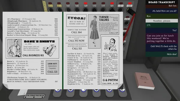 Using the tactile and realistic switchboard interface, receive and route telephone calls from all over town. Make use of various illustrated directories and documents for reference and guidance. Work quickly and precisely – your overbearing boss won’t tolerate poor performance.