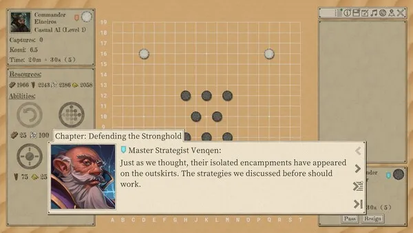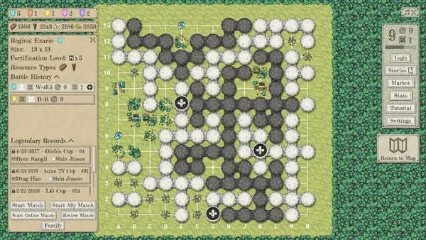 , the player will compete against nations for control of land and resources through a campaign mode with Go gameplay. Players will improve their skills by playing matches, reviewing matches, and solving Go problems. Several educational and AI assisted features are available to help new and experienced players. Once the player has grasped the basics, they can also challenge opponents online from around the world.