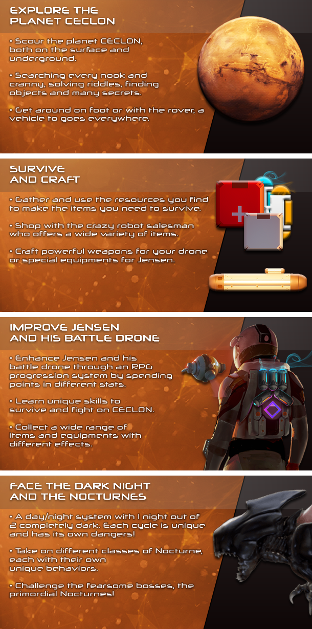 Alone in this arid desert, you must survive, understand what happened and leave the planet CECLON, bringing the precious Veka energy back to Earth. Will you fail in your mission, or will you be a survivor and savior of humanity?
