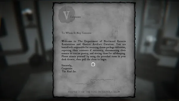 Welcome to The Department of Nocturnal Reverie Restoration and Oneiric Artifact Curation. You are henceforth responsible for receiving dream package deliveries, repairing their contents if necessary, documenting their essence in concise poetry, and storing them for safekeeping. Please situate yourself by using the provided items in your desk drawer, then pull the chain to begin.