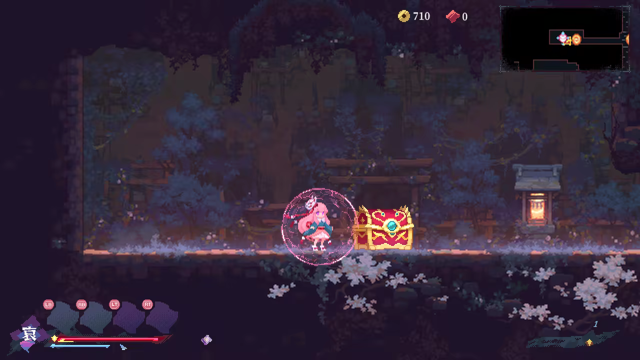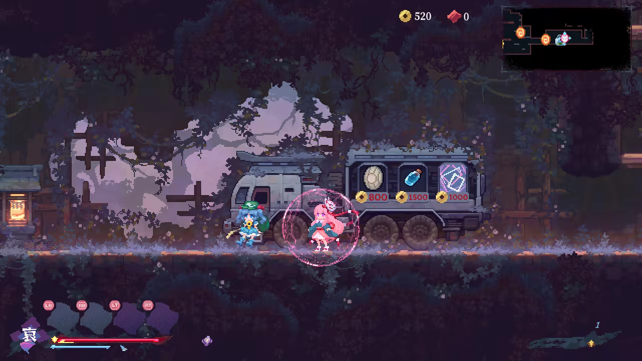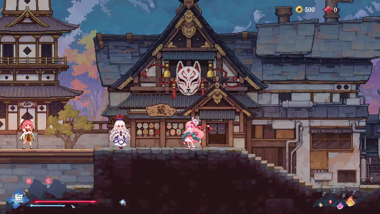 This is a fast-paced side-scrolling action game with roguelite elements. Follow Hata no Kokoro as she explores and defeats enemies on the stage of Gensokyo.