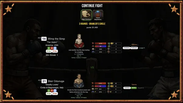 Allocate cash to increase your boxers’ base stats. Each stat contributes to a boxer’s overall performance in the ring and can be improved. Some stats have stars, meaning the boxer is talented.