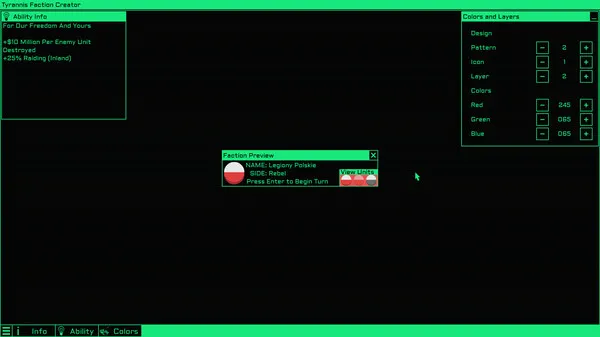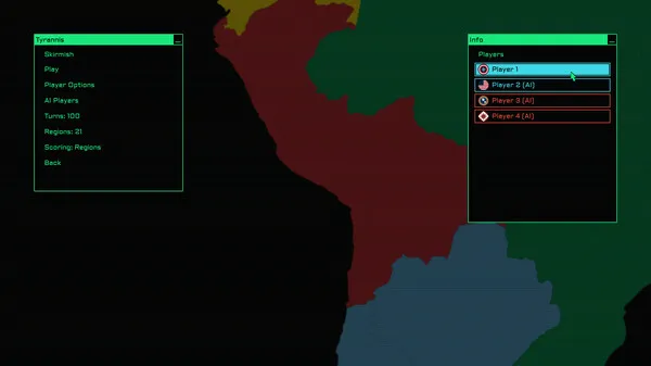 Tyrannis features twenty-one regions for you to defend or liberate, twenty-eight different factions with different abilities to encourage different strategies, as well as an AI with a modifiable aggression, offensiveness, and randomness on a per-player basis.
