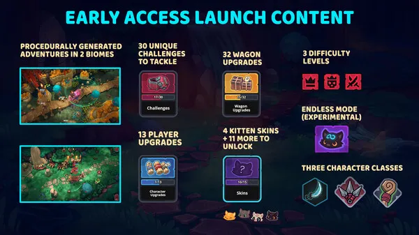 is a couch co-op game full of action, teamwork and woodland critters. One to four players take on the role of brave little cats defending their wooden wagon on its way through a dangerous forest.